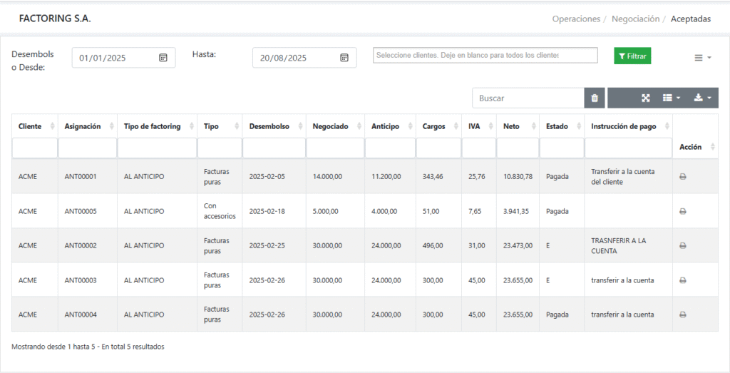 Desde que las solicitudes de factoring son desembolsadas, es decir, se paga al cliente, se consideran negociaciones de factoring. Antes de eso son solicitudes, que pueden ser no aceptadas al final.