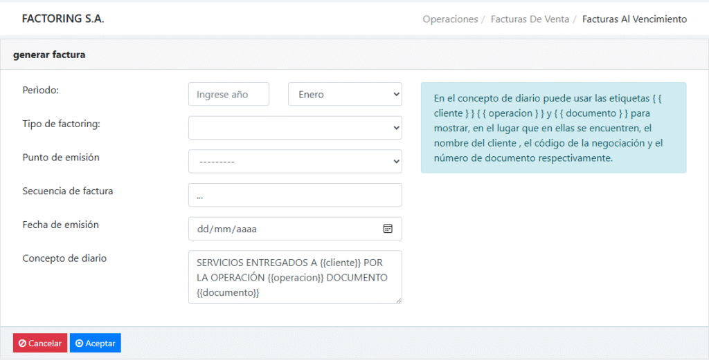 Esta sección tratará sobre la generación de facturas al vencimiento. Para tratar sobre facturas en negociación vea ¿Cómo generar las facturas por servicios al cliente?