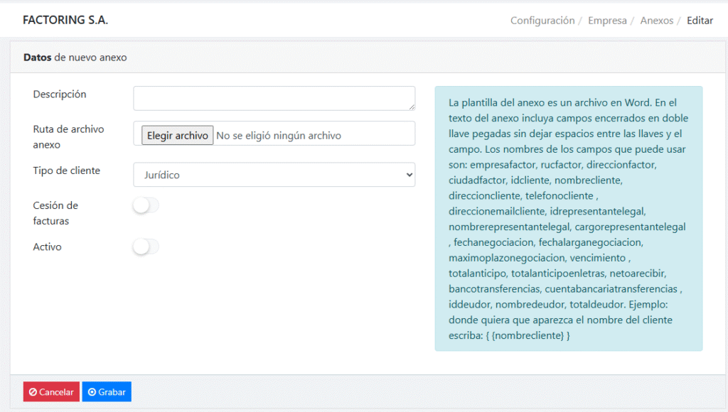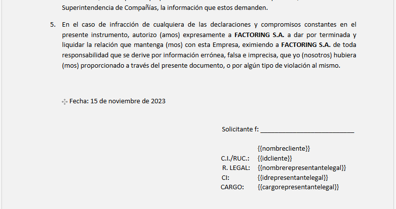 Como cada empresa de factoring tiene sus propios formatos ya definidos, lo ideal es que se suban al sistema a manera de plantillas, para que se generen de forma automática con los datos de la operación.