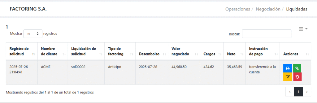 El proceso de la negociación del factoring termina cuando se registra el desembolso al cliente, luego de generar la liquidación de la solicitud, por esa razón, antes de ejecutar esa opción en el sistema, tendrá la ocasión de generar los anexos requeridos para las firmas respectivas y completar la carpeta de documentos correspondientes a la negociación.