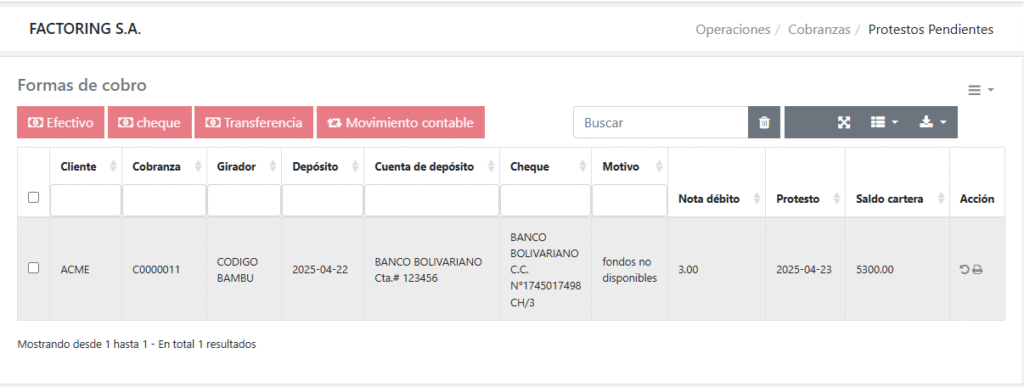De esa manera el valor a cobrar del protesto, será el indicado en la columna Saldo cartera.