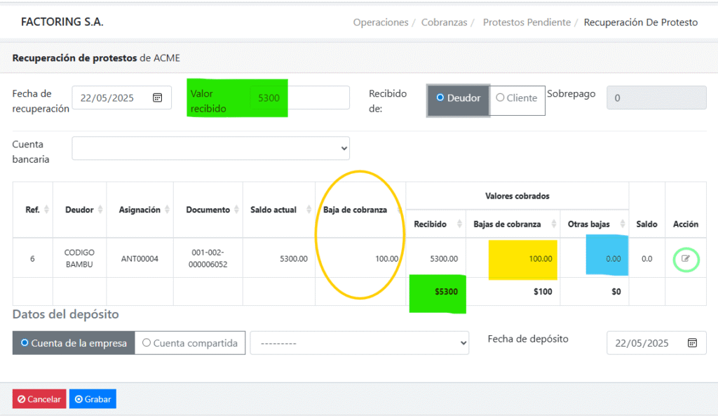 En caso de no recuperar todo el valor del protesto, modifique los valores cobrados usando el botón Cobro ubicado en la columna Acción, encerrado en un círculo verde en la imagen anterior. No podrá modificar el valor de la columna Bajas de cobranza.