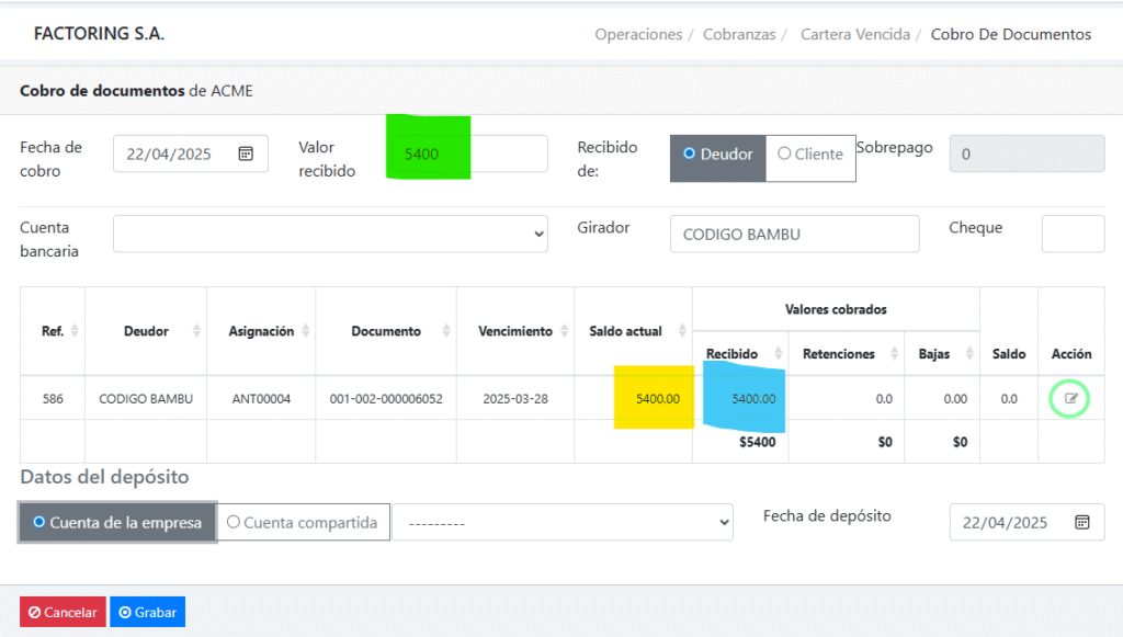 Al momento de registrar el documento a negociar en la solicitud de factoring, tuvo la opción de agregar los valores por retención que se aplicarían sobre la factura, dejando un valor negociable menor. Si lo hizo de esa manera, llegada la fecha de vencimiento, solo debería registrar ese valor en la pantalla de cobro.