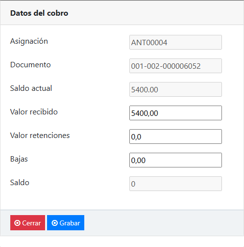 Antes de grabar la cobranza, verifique que el sobrepago tenga el valor correcto.