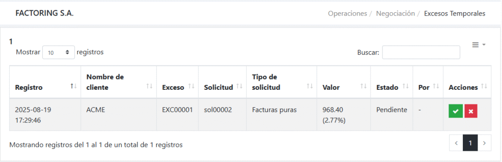Si decide rechazar el exceso, se reversan los valores cargados en el utilizado del cliente y la solicitud vuelve a mostrarse en la lista de solicitudes pendientes.