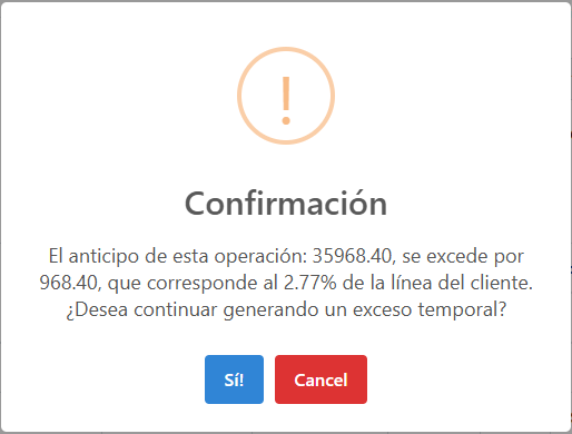 En la ventana de alerta se puede observar el porcentaje que representa el valor de exceso sobre la línea del cliente, lo que le da al usuario un criterio para crear o no el exceso temporal.